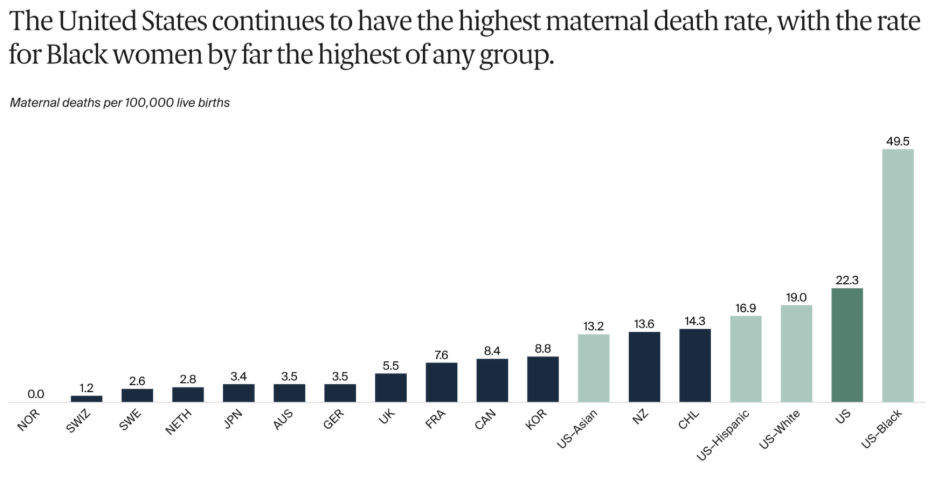 Despite spending more on pregnancy, childbirth, and post-partum care than any other high-income country (an average of over $20,000 per birth, per data analysis by Peterson-KFF) the U.S. continues to have much worse maternal health outcomes, a trend that’s been rising for decades. Maternal mortality is highest for Black women.
